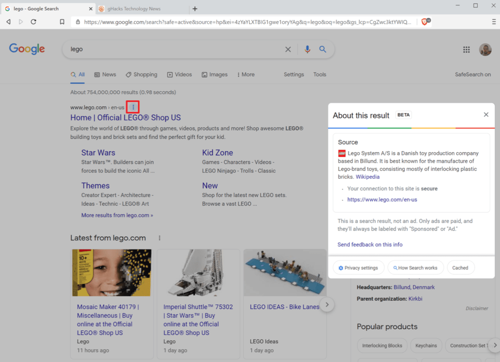 Компания Google начала внедрение новой функции поиска Google для пользователей в Соединенных Штатах. Это изменение добавляет меню из трех точек к каждому сайту, указанному в результатах поиска Google. Щелчок по меню отображает наложение с информацией о веб-сайте.