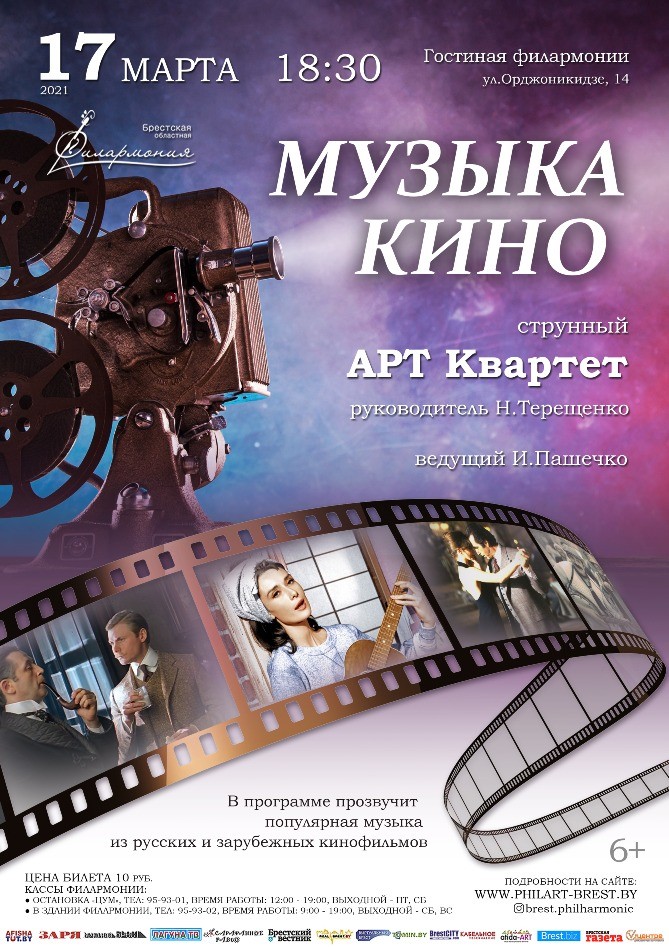 17 марта в Брестской областной филармонии пройдет концерт струнного АРТ Квартета под управлением Н. Терещенко. В программе вечера – популярная музыка из отечественных и зарубежных кинофильмов.