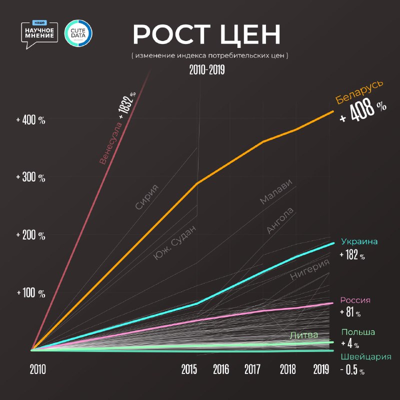 «Чемпионы» этой гонки вследствие разных причин показали невероятный рост цен всего за один год. А с учетом продолжающегося политического кризиса в Беларуси, наша страна может в скором времени приблизиться к Венесуэле.