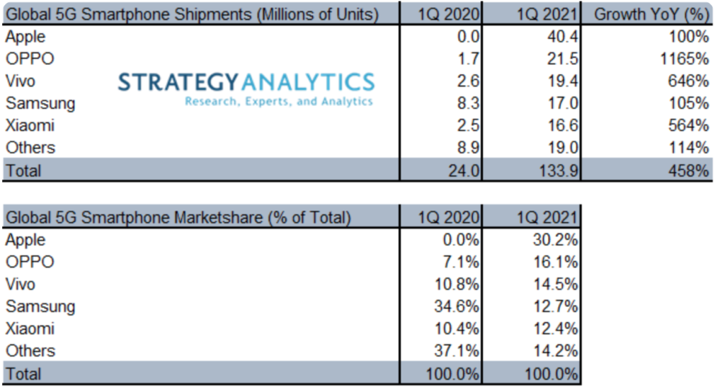 Компания Apple не поставила ни одного смартфона 5G в 1 квартале 2020 года, но уже в 1 квартале 2021 года смогла достичь отметки в 40,4 миллиона iPhone 5G . Доля Apple на рынке достигла рекордных 30,2%.