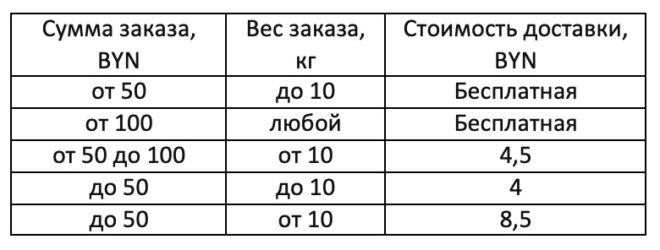 Радиус доставки не превышает 2 километров от магазинов. В случае превышения доступной зоны доставки клиенты должны будут заплатить (за каждый дополнительный километр). Также действует сумма минимального заказа для осуществления доставки: сумма заказа должна быть не меньше 50 белорусских рублей. В зависимости от соотношения сумма заказа – вес заказа доставка может становиться платной.