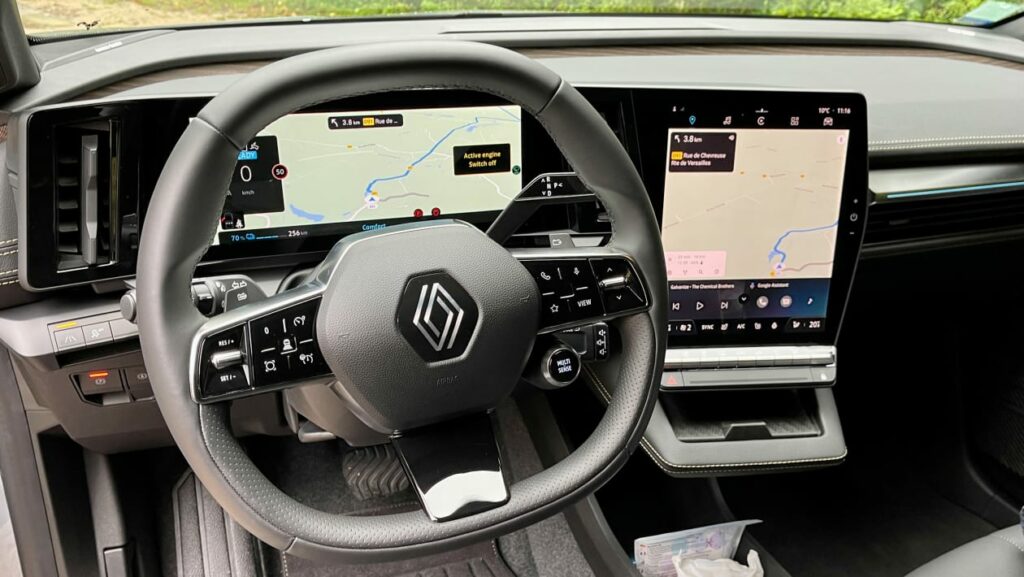 Внутри Renault Megane E-Tech Electric с двумя 12-дюймовыми дисплеями. На экране информационно-развлекательной системы работает новая система Google с системой голосового управления, в то время как физические кнопки и циферблаты для климат-контроля были сохранены.