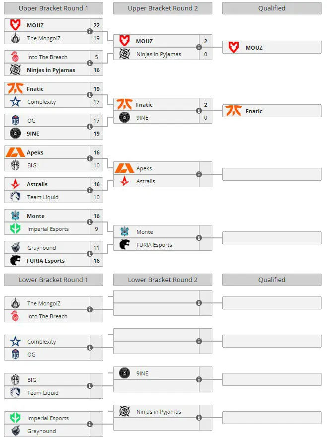 Обладателями первых квот, заслуживших выход в основную часть турнира, стали команды MOUZ и Fnatic. Они успешно сыграли по два поединка: MOUZ одолели Ninjas in Pyjamas и The MongolZ, а Fnatic — 9INE и Complexity. Оба коллектива выступят в группах уже 29-го июля. До этого момента команды будут ожидать оставшихся участников.