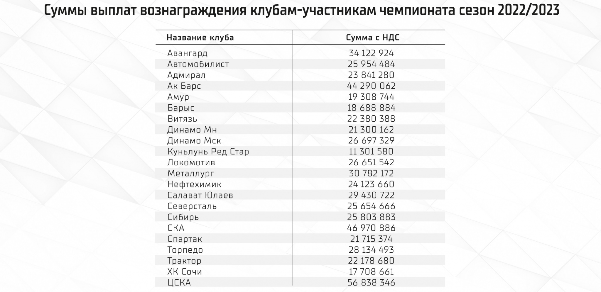 Сообщается, что схема выплат клубам будет стандартной. Так, 30% от суммы в равной степени получат 22 участника лиги, 40% распределят по телеспросу (чьи телевизионные права дороже). Остальные 30% будут выплачены по спортивному принципу: 15% полагается всем участникам плей-офф, 4,5% уйдет всем участникам чемпионата, 3% непосредственно финалисту, 7,5% отдельно обладателю Кубка Гагарина.