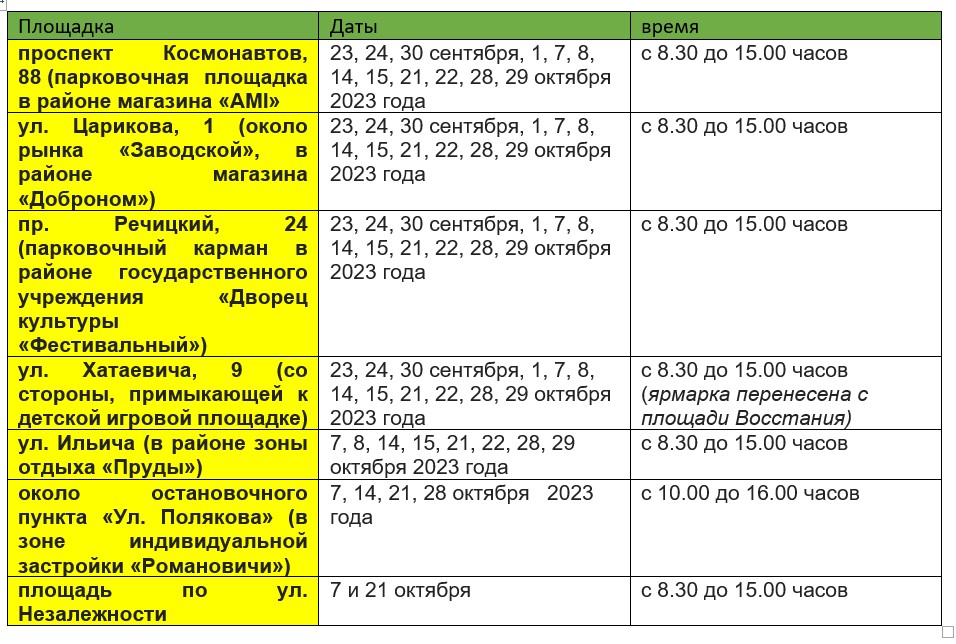 С 23 сентября на 7 площадках Гомеля каждые выходные будут проходить региональные сельскохозяйственные ярмарки выходного дня. Сохраняйте себе расписание, чтобы не пропустить возможность купить свежий урожай по низким ценам.