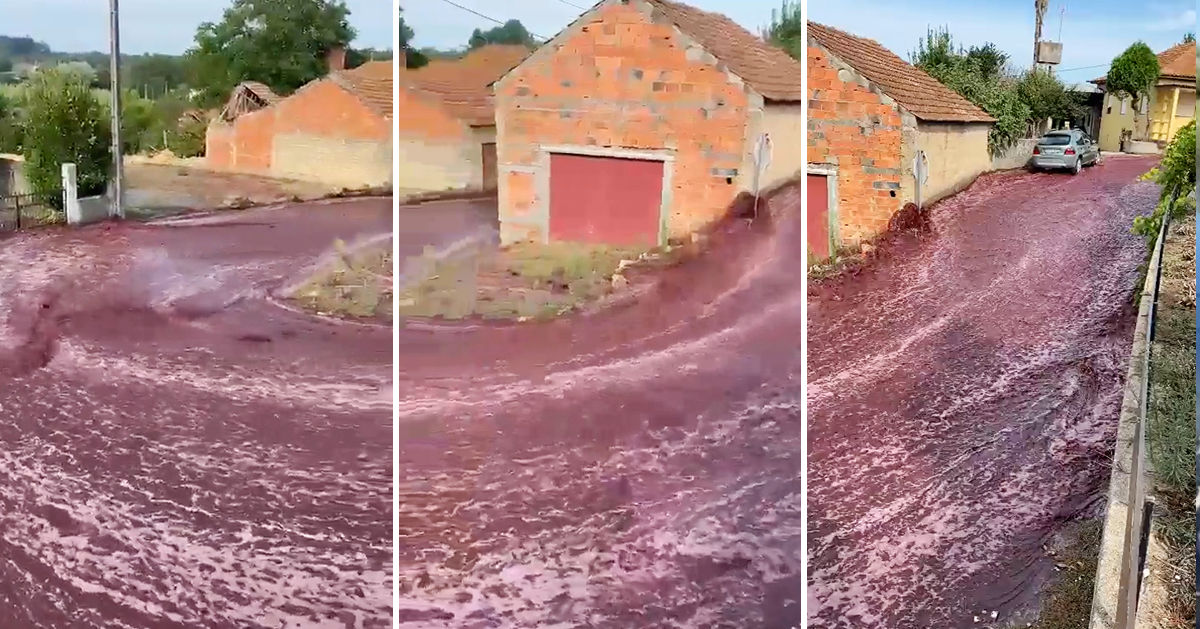 Сообщается, что на улицы Анадии из-за аварии, которая случилась на местном винном заводе Destilaria Levira накануне, 10 сентября, вылились миллионы литров красного вина.