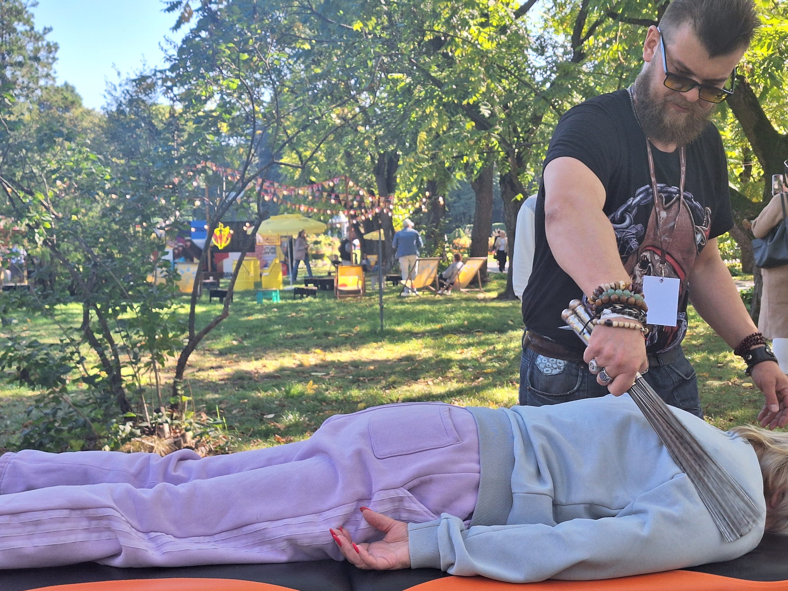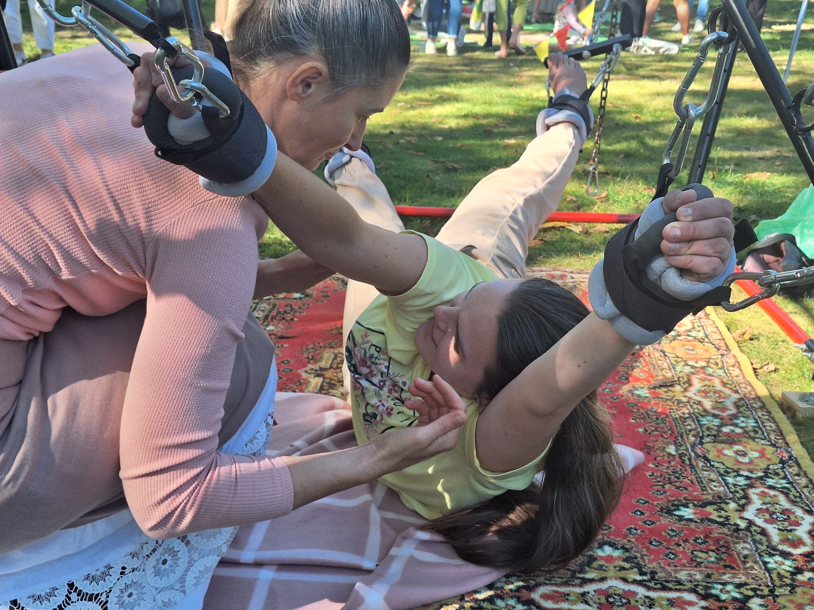 Неподалеку на дзен-споте инструкторы RebootHome Светлана и Константин делают желающим массаж и дают попробовать тренажер Правило (от слова исправлять). На него ажиотажная запись на три часа вперед. Прямо в саду дают 15 минут повисеть с привязанными руками и ногами и почувствовать каждый позвонок и мышцу. При этом медленно вращаясь.