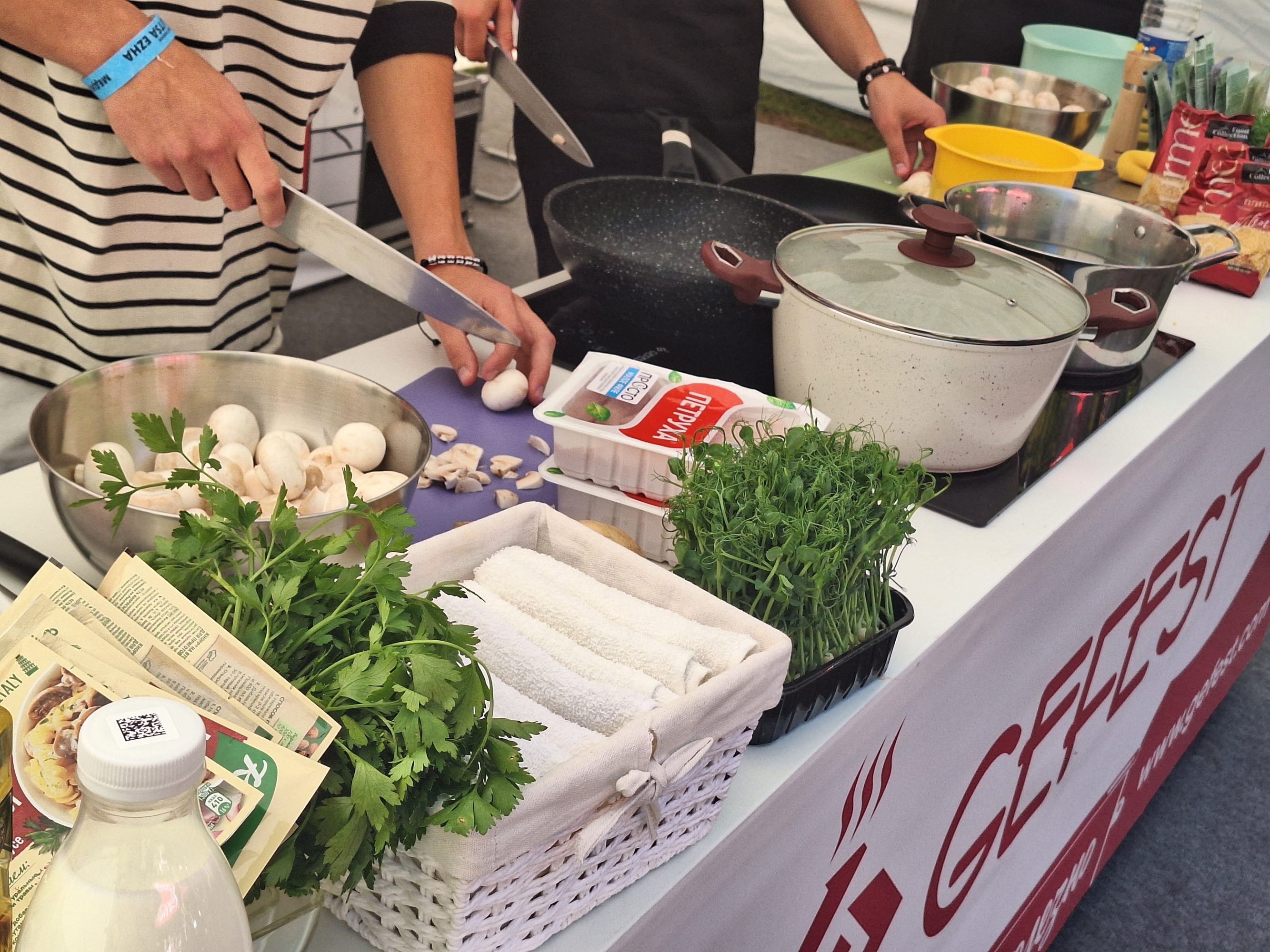 Рядом в кулинарной школе Gefest, как нарезать продукты и чем сотейник отличается от кастрюли или сковороды, рассказывает бренд-шеф Noodles Виктория Реуцкая. Она готовит суп из кабачков. Тут и секрет. Сотейник идеален для тушения нежных ингредиентов, так как сочетает в себе лучшее от кастрюли и сковороды.