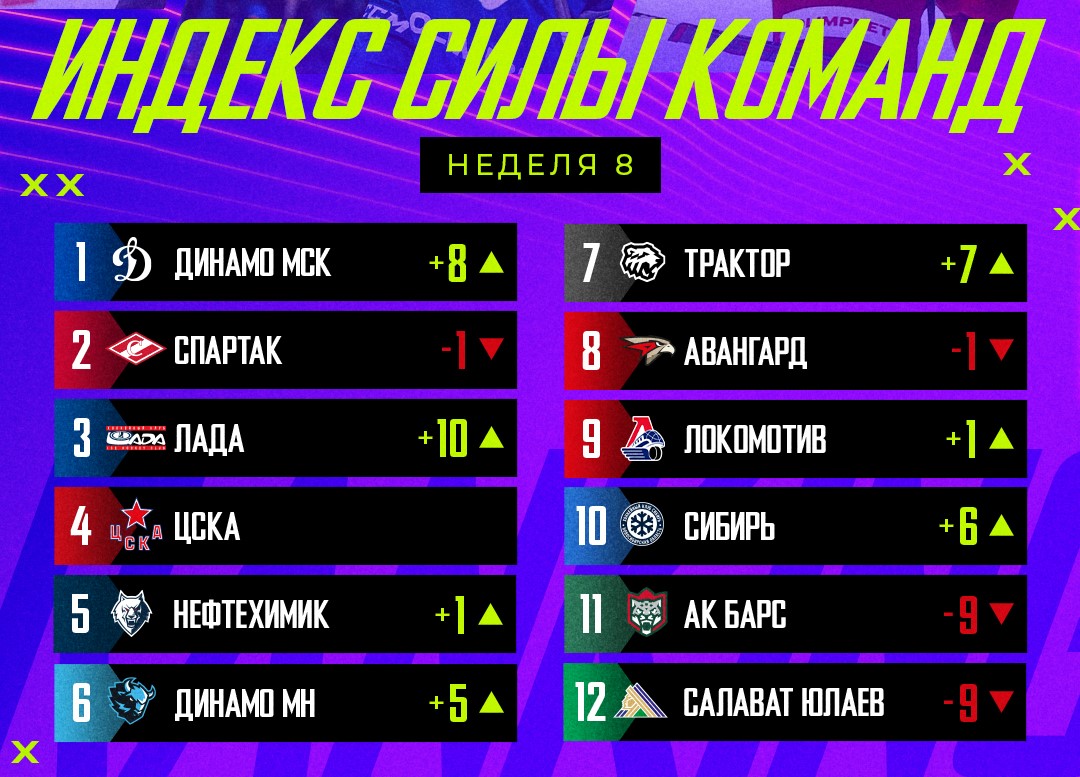 Индекс силы отображает, в какой форме находится та или иная команда в данный период. По сравнению с предыдущей неделей белорусский клуб добился прогресса благодаря гостевым победам над «Барысом» (2:1 ОТ) и «Авангардом» (4:3).