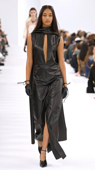 Кожаные платья Givenchy наглядно демонстрируют складки на юбках в области бедер, как бы заявляя, что в этом плате можно просто полноценно жить.