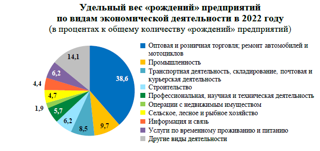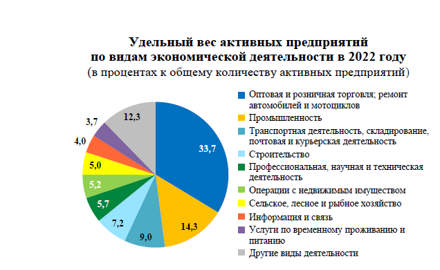 Согласно отчету больше всего активных предприятий в Беларуси в 2022 году было в сфере оптовой и розничной торговли (33,7%), второе место занял промышленный сектор (14,3%), меньше всего активных коммерческих организаций было зарегистрировано в сфере услуг по временному проживанию и питанию (3,7%).