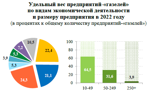 Удельный вес предприятий-«газелей» Беларуси в 2022 году по видам экономической деятельности распределился следующим образом: больше всего «24,3%» из оказалось в сфере информации и связи, второе место у предприятий промышленного сектора (22,4%), оптовая и розничная торговля уверенно замыкает тройку лидеров (21,1%). Меньше всего предприятий-«газелей» в транспортной деятельности, складировании, почтовых и курьерских службах.