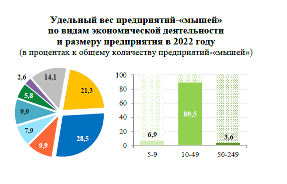 Предприятиями – «мышами» также считают организации с высоким темпом роста, однако с численностью сотрудников до 10 в первый год работы, за который идет расчет. Тройка лидеров по направлению деятельности также, что и с «газелями», но распределение мест разное. Больше всего небольших компаний со стабильным ростом в сфере оптовой и розничной торговли (28,5%), далее идет промышленность (21,3%), а вот в сфере IT компаний-«мышей» всего 9,9%. Самый низкий показатель маленьких быстро развивающихся компаний в сфере услуг по временному проживанию и питанию.