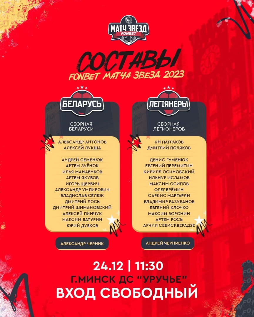 24 декабря в минском дворце спорта «Уручье» состоится товарищеский шоу-матч, в котором сыграют сборная Беларуси и сборная легионеров, выступающих в белорусском чемпионате. Начало мероприятия – в 11.30.