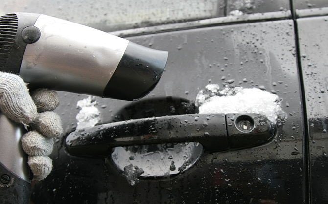 Бытовой фен или обогреватель. Их возможно применить, если есть доступ к электричеству. Обогреватель можно поставить рядом с дверью. Фен нужно направить непосредственно на замок. Не используйте мощные строительные фены – они могут перегреть механизм и повредить замок. Феном можно отогреть и уплотнители, направив струю воздуха в зазоры между дверью и кузовом.