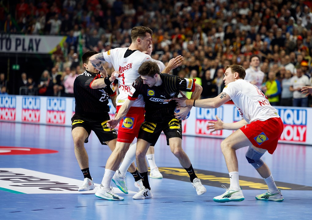 Второго финалиста определяли чемпионы мира датчане и хозяева еврофорума немцы. «Бундестим» со скрипом вышла в полуфинал, вскочив в последний вагон во много благодаря осечкам конкурентов. Однако в важном сражении дали бой главному фавориту. Скандинавы впервые смогли выйти вперед на 37-й минуте, когда сделали счет 16:15 в свою пользу. После этого хозяева постепенно начали «сыпаться» и о лидерстве больше не помышляли. Таким образом, сборная Дании в третий раз вышла в финал чемпионата Европы.