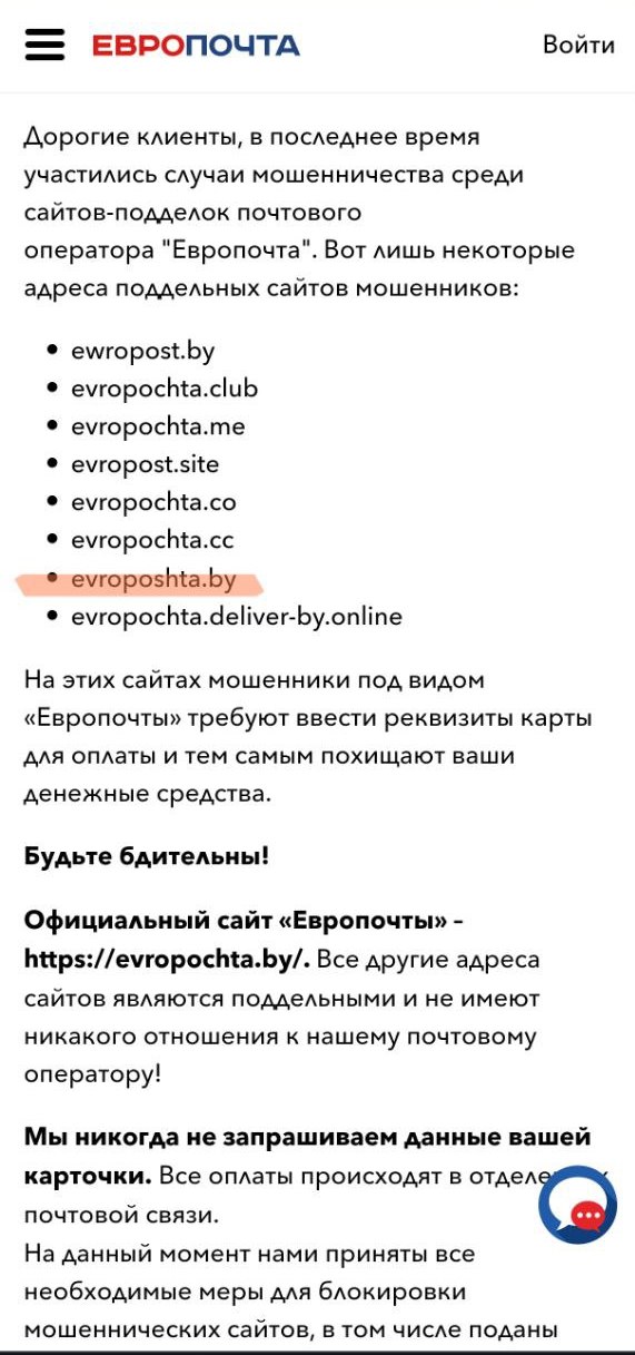 Куфар – площадка для продажи товаров с рук. Часто здесь продают бывшие в употреблении вещи, реже – новые. Мы привыкли, что «кидалово» заключается в том, что жертва ищет товар, переводит деньги преступнику-продавцу и в итоге остается без денег и без товара. Но о все чаще случается другая история: мошенник связывается с продавцом, предлагая оформить доставку товара к себе. При этом скидывается ссылка на сторонний ресурс. Часто это подделки службы европочты, так что смотреть нужно внимательно. На сайте службы доставки есть перечень сайтов-подделок. Смотрите, как соблазнительно выглядит, к примеру, evroposhta.by