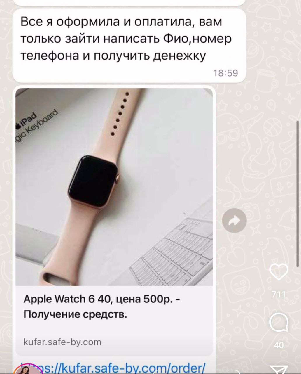 Пример переписки с мошенниками на Куфаре приводит ниже. Скрипт прост: мне понравился Ваш товар, пару уточняющих вопросов по нему для демонстрации заинтересованности, дальше – я не из Вашего города, сейчас закажу курьера и ссылка, куда надо перейти.