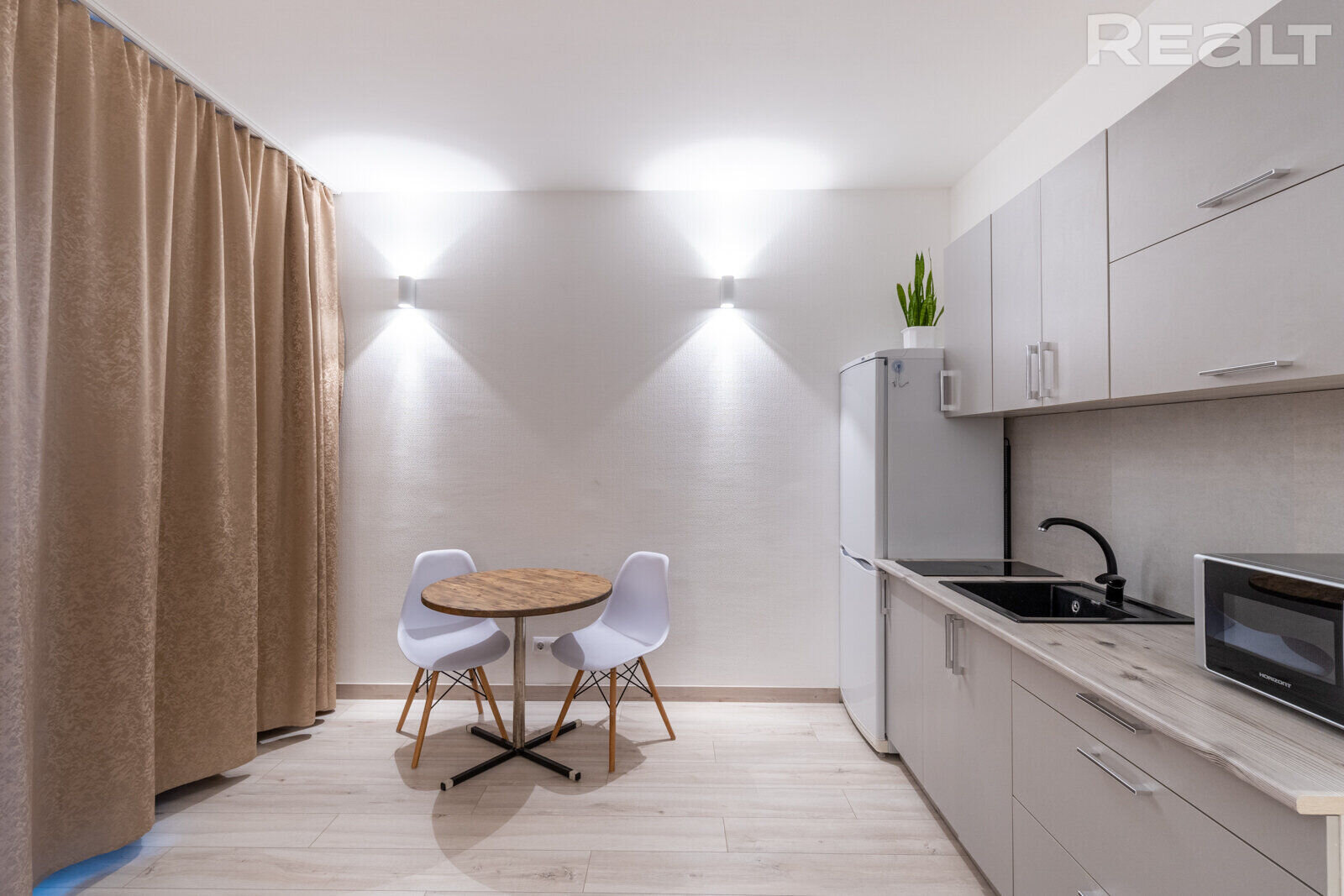 В студии есть мебель: шкаф, кровать, кухонный гарнитур с обеденным столом и стульями. Из бытовой техники имеются холодильник, встроенная панель для готовки, а также микроволновка, как видно на снимках.
