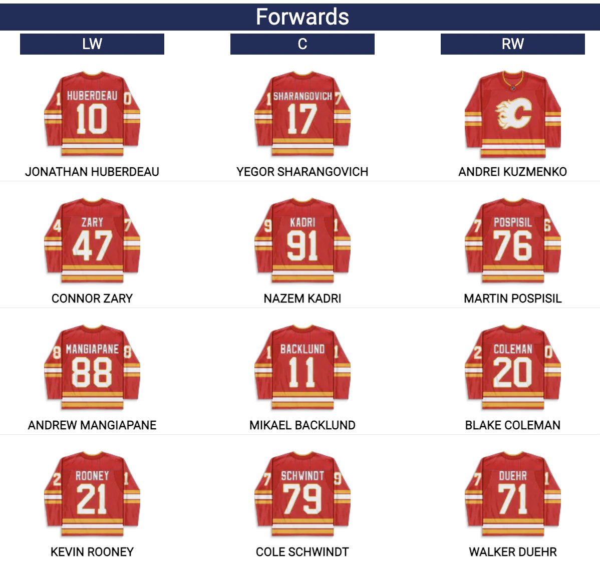 Главный тренер «Калгари» Райан Хаска так прокомментировал некоторые изменения в первом звене: «Мы хотели использовать кого-то, кому комфортно играть на этой позиции. У нас есть и другие варианты, которыми, думаю, мы будем пользоваться. Пока хотим посмотреть, как будет выглядеть это сочетание».