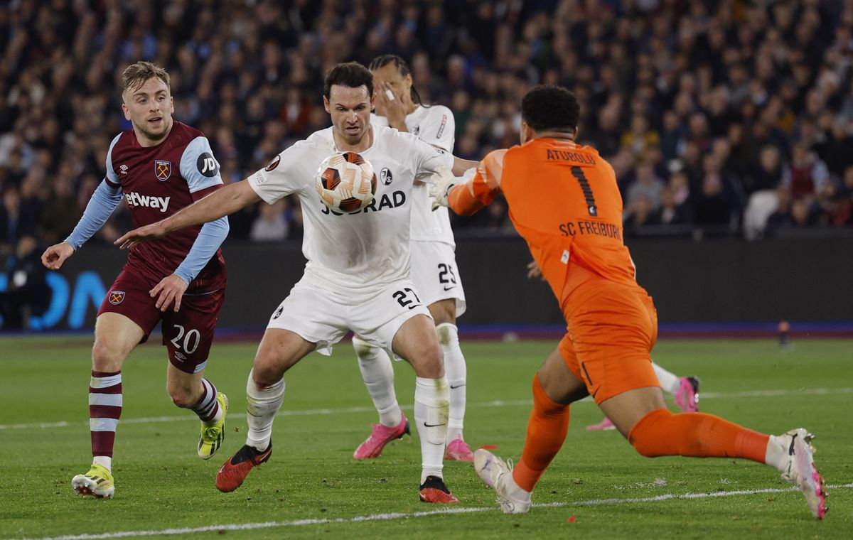 Soccer Football — Europa League — Round of 16 — Second Leg — West Ham United v SC Freiburg — London Stadium, London, Britain — March 14, 2024 SC Freiburg’s Nicolas Hofler and Noah Atubolu in action with West Ham United’s Jarrod Bowen Action Images via Reuters/Andrew Couldridge