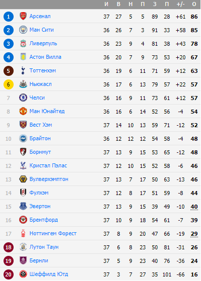 По итогам матчей 37-го тура в Английской Премьер-Лиге на чемпионский титул по-прежнему претендуют «Арсенал» и «Манчестер Сити», которые в своих поединках добились побед.