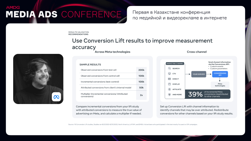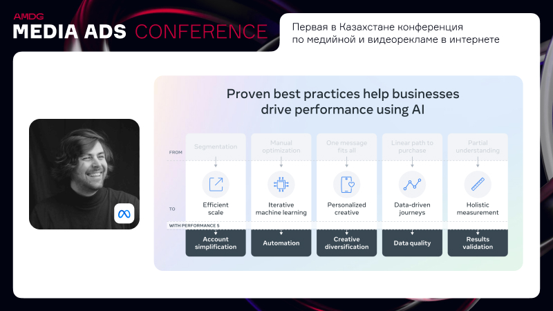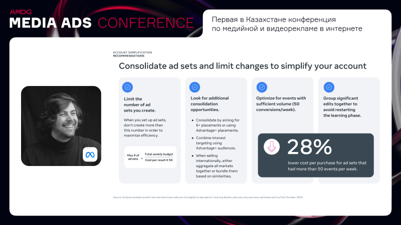 Такие кампании, как Advantage+ помогают рекламодателям оптимизировать настройку и результаты РК с помощью AI-технологий. Спикер подчеркнул, что кампании этого типа приводят к снижению CPC на 17% и росту ROAS на 32%.