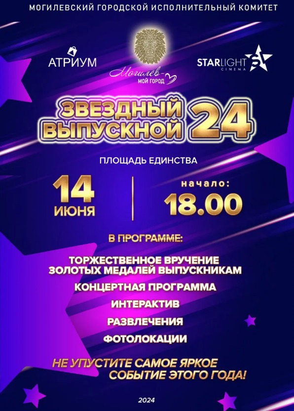 «Звездный выпускной-2024» обещает стать ярким и запоминающимся событием в жизни Могилева. Организаторы делают ставку на интригу и эффект неожиданности, сохраняя в тайне имена некоторых артистов. Одно можно сказать с уверенностью: площадь Единства вновь превратится в море музыки, танцев и праздничного настроения, подарив выпускникам незабываемый вечер прощания со школой.