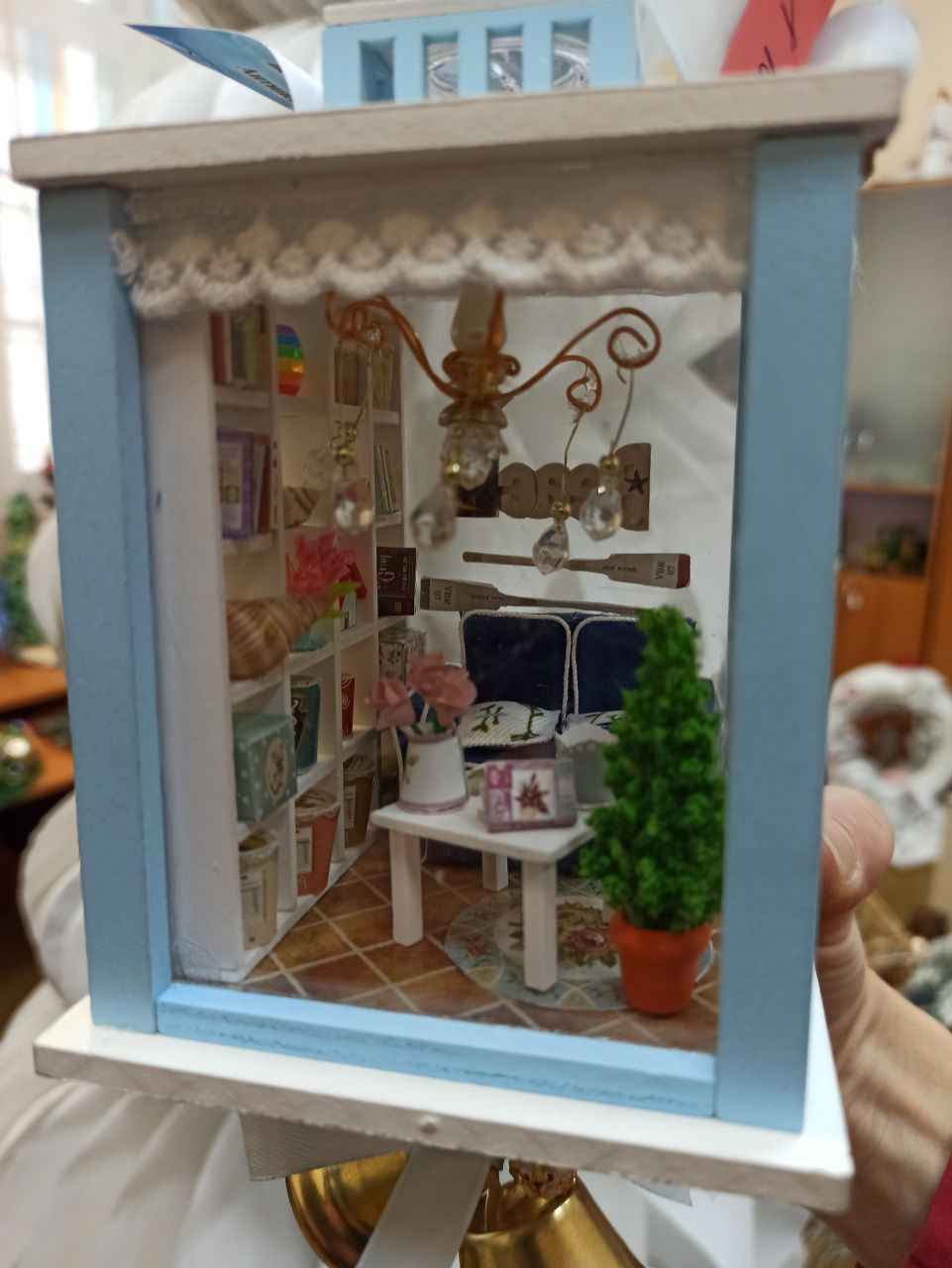 Преподаватели и учащиеся политехнического колледжа представили «Рождественский фонарик». Миниатюрные элементы декора, люстра и деревца выполнены из полимерной глины.