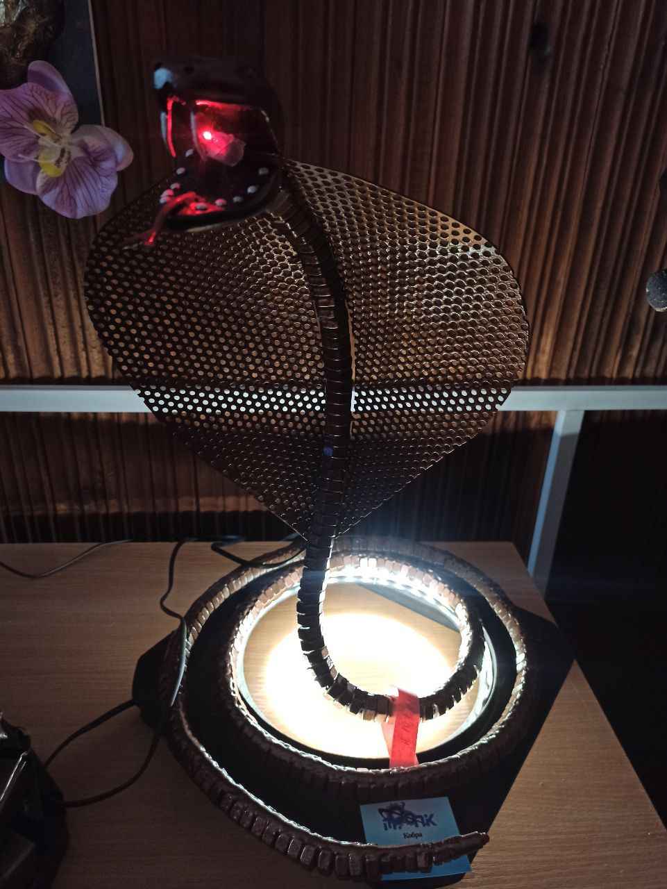 Рядом расположилась композиция «Кобра», выполненная из металла. Основание, капюшон из сита, голова из бруса и гайки, приваренные к металлическому пруту, создают грациозной образ символа Нового года. А огоньки во рту и по периметру фигуры придают праздничную атмосферу.