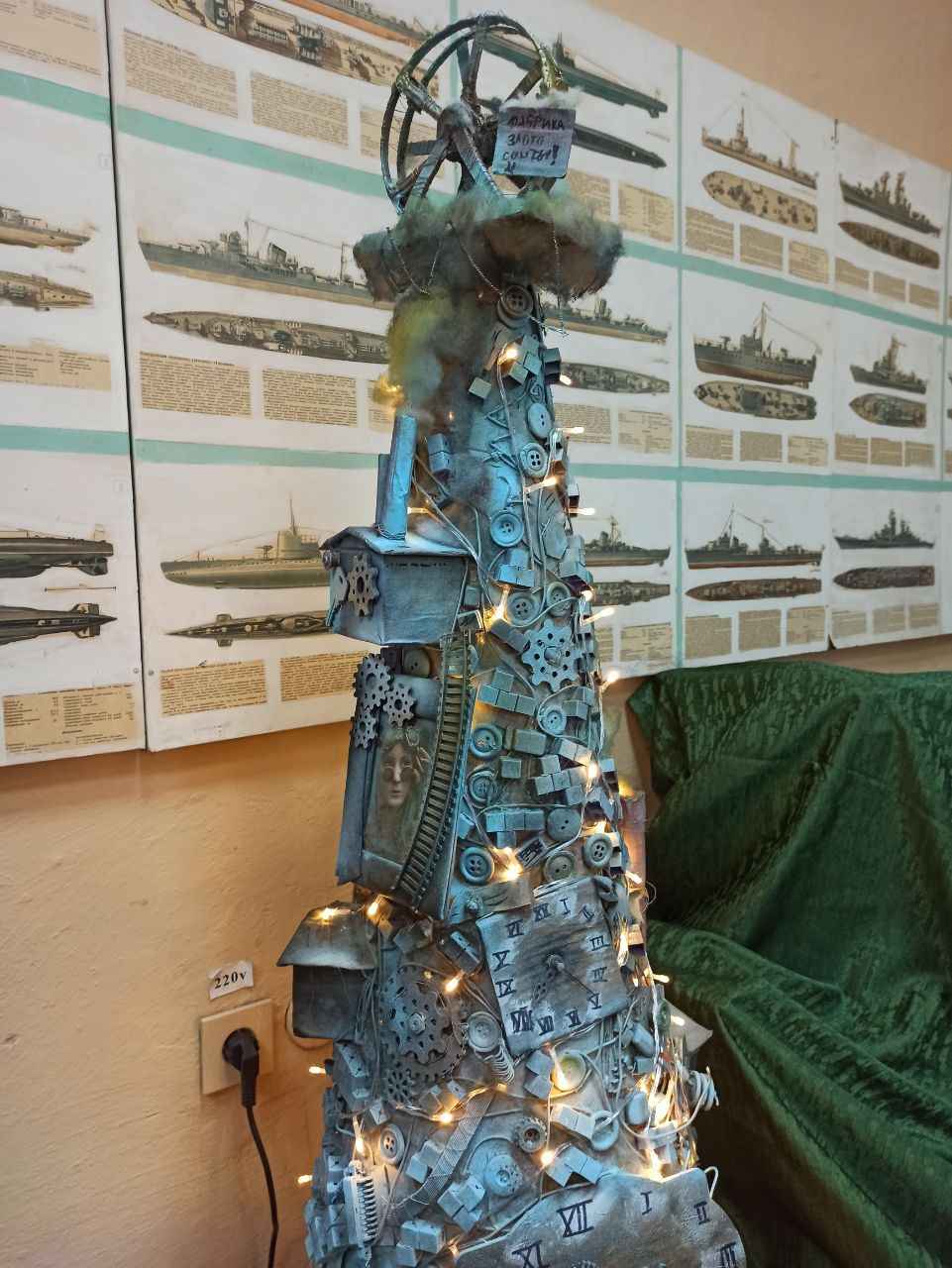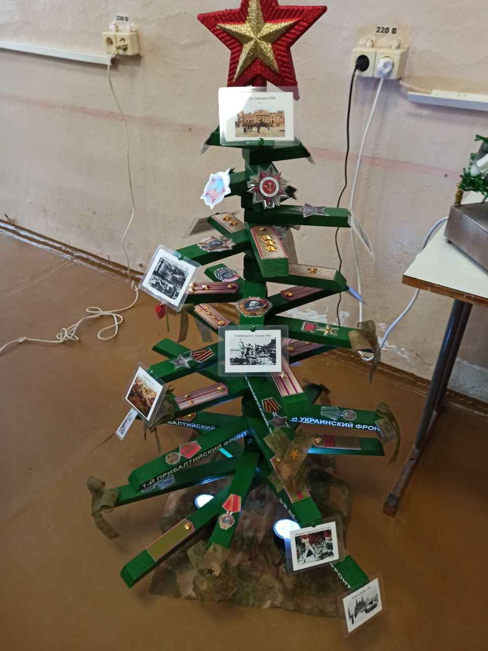 Так, преподаватель иностранного языка Ирина Костерова из Могилевского государственного политехнического колледжа представила «Елку Победы» . Ветки елки символизируют участников войны от солдата до генерала. Погоны, появившиеся в 1943 году, и указатели фронтов расположены на ветках. Фотографии ключевых сражений – Курской битвы, обороны Ленинграда, операции «Багратион» и взятия Берлина – дополняют композицию. Елка украшена маскировочной сеткой и военной атрибутикой, а мини-прожекторы у основания передают тревожную атмосферу военного лихолетья.