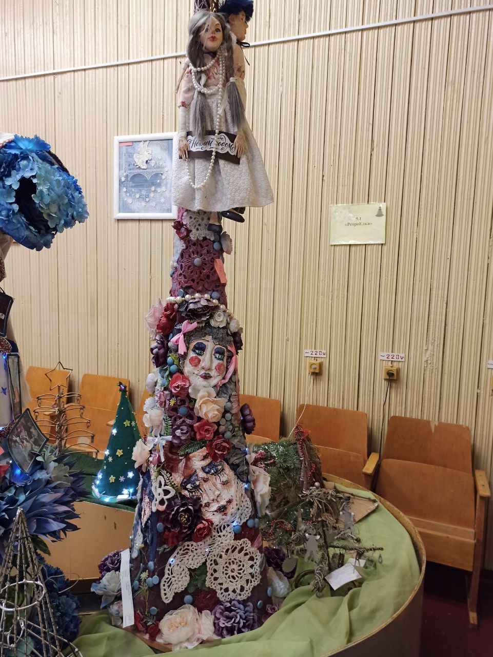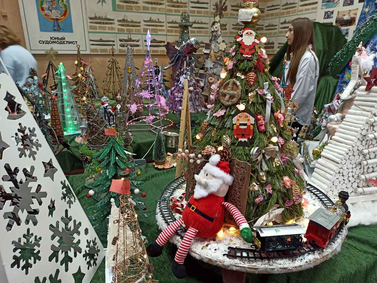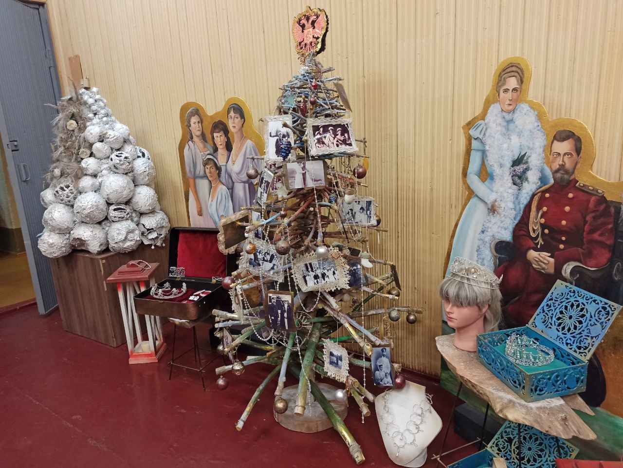 Работы с историческим подтекстом также занимали важное место на конкурсе. Варвара Сидорова, учащаяся третьего курса колледжа, создала фотозону на тему Романовых, где стремилась передать атмосферу их новогодних праздников. Композиция включала фанерные листы с портретами царской четы, винтажные украшения и архивные фотографии. По словам автора, большая часть элементов была сделана из вторичных материалов, что подчеркивает их экологичность и внимательность к деталям.