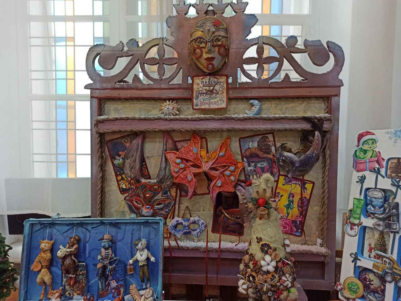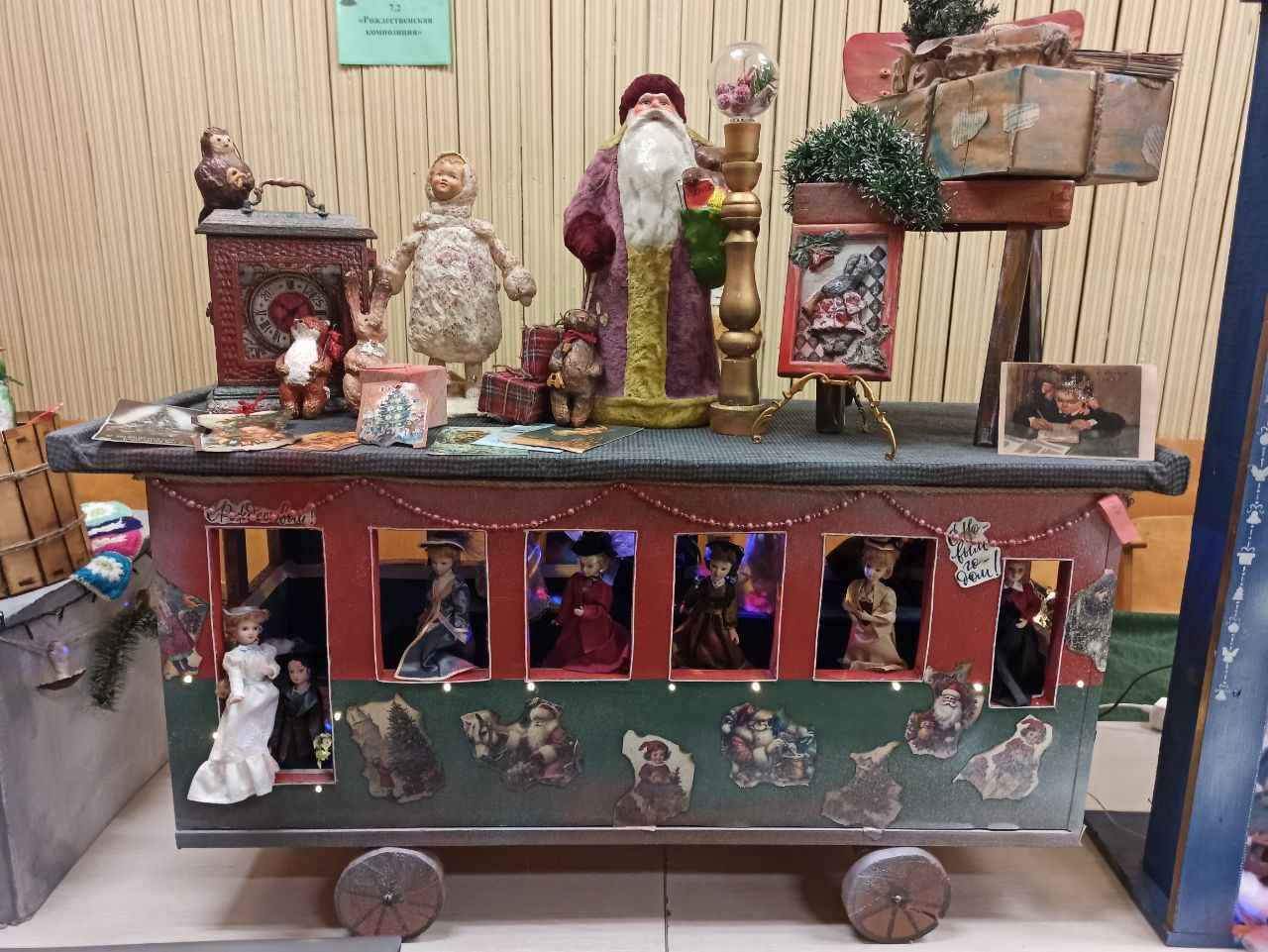 Еще одна работа колледжа – «Праздничный экспресс», выполненный из дерева и пеноплекса, обтянутый тканью и украшенный винтажными открытками, бусинами и новогодними шариками. Внутри вагона размещены куклы ручной работы, а также световой элемент и музыкальная колонка.