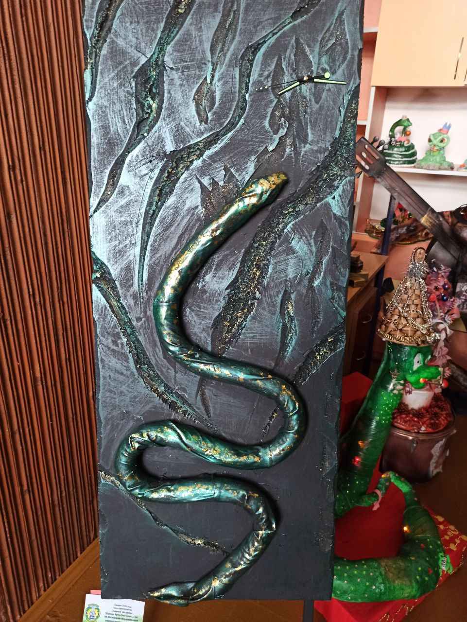Преподаватель Могилевского государственного машиностроительного колледжа Алина Авдеева представила часы со змеей в стиле лофт. Основа и змея выполнены из пеноплекса, обклеены бумагой и покрашены в черный цвет. Рельефные детали вырезаны ножом и выделены золотистой краской. Часовой механизм встроен в основу. Композиция закреплена на металлической подставке.