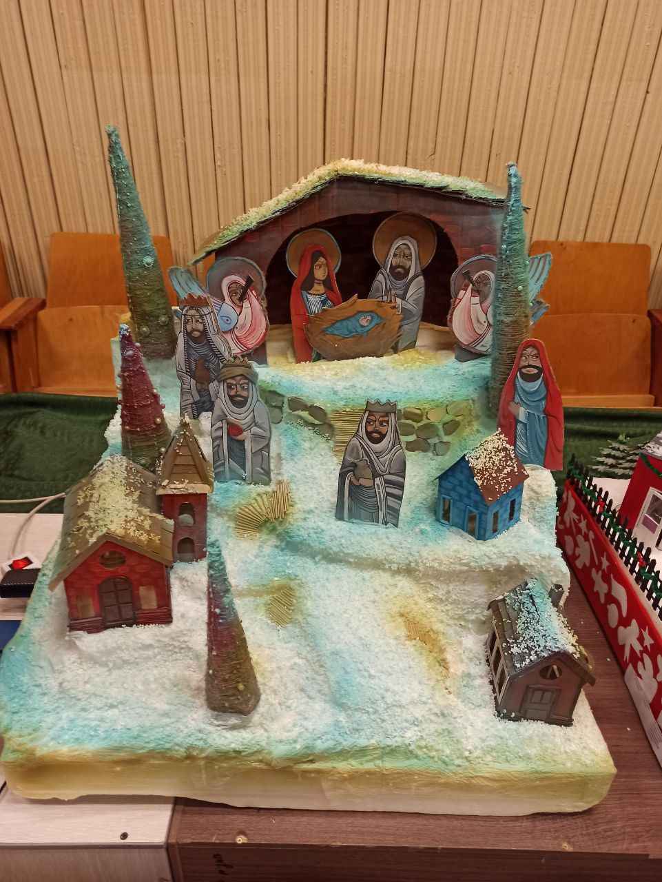 Студентка второго курса экономического промышленно-технологического колледжа Дарья Вербицкая представила арт-объект «Рождение Христа». Центральная сцена – дом, где изображены Иосиф, Мария и младенец Иисус. Вокруг размещены фигуры людей и домики. Каркас выполнен из пенопласта, домики и фигуры – из картона. Дорожки сделаны из шпажек, а елки – из картона, обмотанного бечевкой и украшенного бусинами и бисером.
