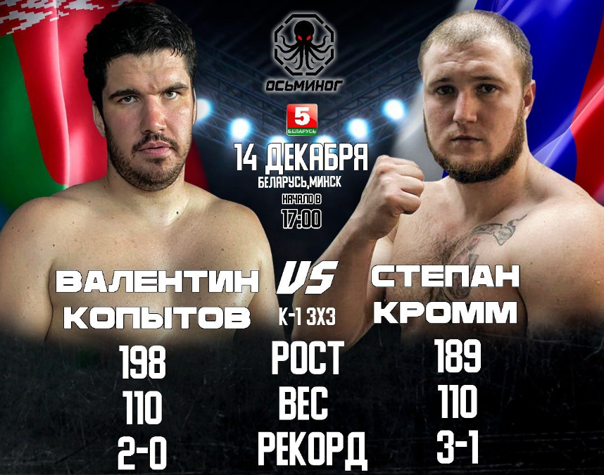 В пятой паре — бойцы-супертяжеловесы, весовая категория свыше 100 килограмм. Сошлись Валентин Копытов (Беларусь) и спортсмен из России Степан Кромм.