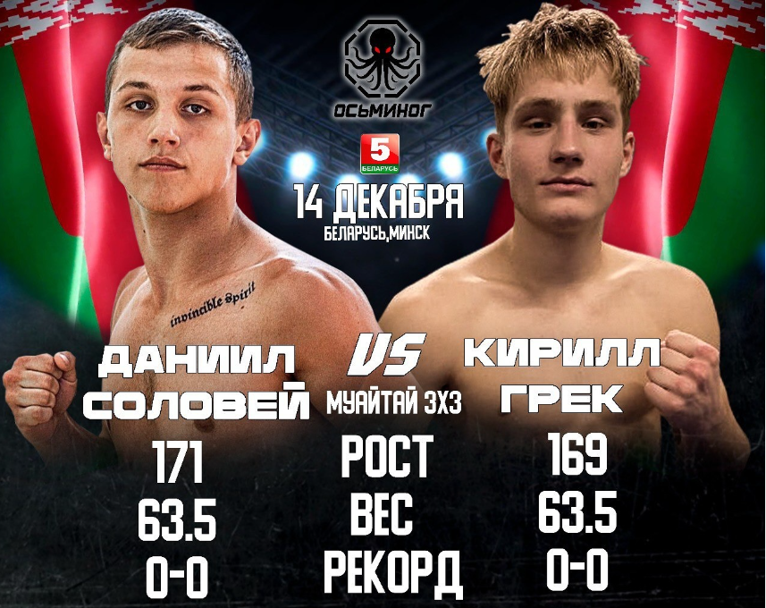 Первая пара бойцов, весовая категория до 63,5 кг: Соловей Даниил из Полоцка и Кирилл Грек из Минска.