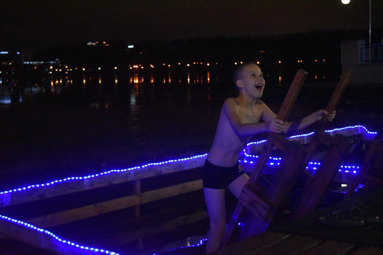 Дети реагируют по-разному. Кто-то смело лезет в воду, ведет себя уверено, хоть и сжимается все. Другие так и не рискнут окунуться, потопчутся рядом, помочат ноги – отойдут. Некоторых заманивают родители, помогают окунуться. И слышен детский смех, вырываются, оказываются в воде, хохочут и спешат выбраться на берег. Малышей и вовсе на ручках заносят в воду. Правда, не все крохи могут оценить купания в ледяной воде, кто-то и плакать начинает.