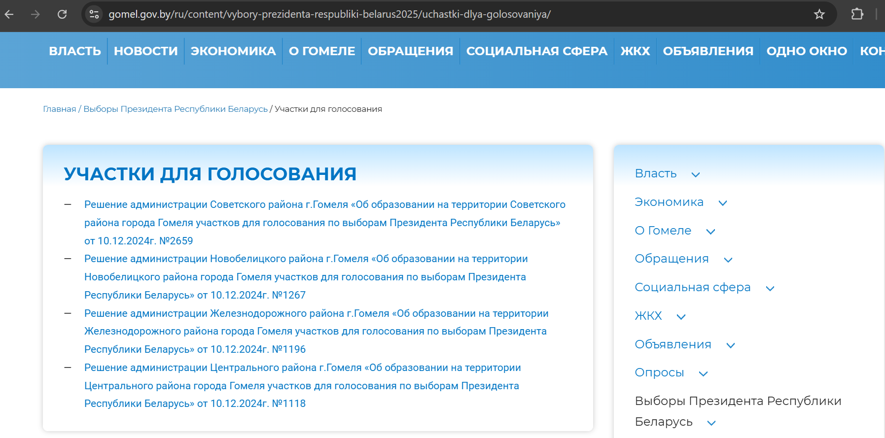 Чтобы узнать, где находится ваш участок для голосования в Гомеле, посетите сайт Гомельского городского исполнительного комитета. На главной странице найдите баннер «Выборы Президента Республики Беларусь», затем перейдите в раздел «УЧАСТКИ ДЛЯ ГОЛОСОВАНИЯ». В перечне районов выберите ваш, найдите адрес своего проживания и определите номер участка, на котором вы будете голосовать.
