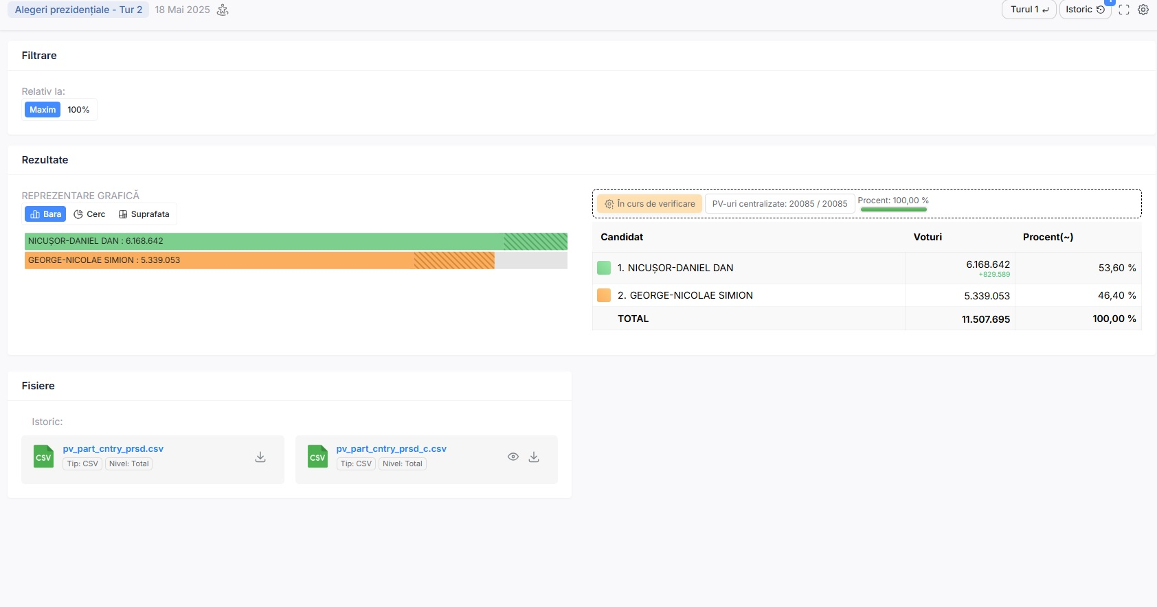 По мере подсчёта бюллетеней вечером 18 мая ситуация на табло изменилась. Если на старте голосов больше набирал Симион, то позже преимущество постепенно перешло к Дану. Итоговый расклад после обработки 100% бюллетеней оказался таков: за Никушора Дана проголосовали 53,60% избирателей, а за Джеордже Симиона 46,40%. Таким образом, кресло президента достаётся столичному мэру.