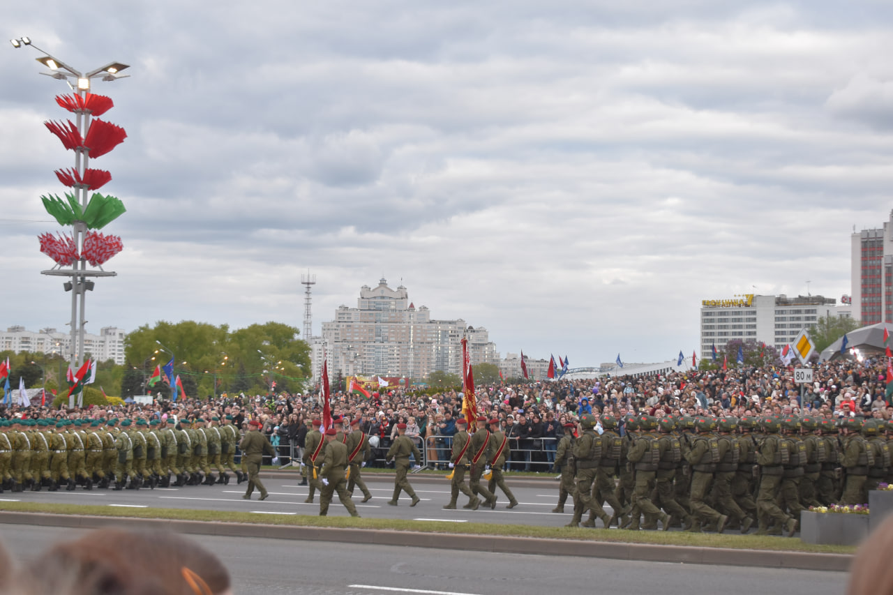 Сразу стало понятно, что торжественную часть и движение пеших расчетов придется смотреть на экране. К сожалению, их было установлено не много. Нам были видны два: один сзади, второй далеко. Пришлось спуститься с горочки, чтобы посмотреть, а кто там идет и говорит. Благо все торжественные речи и объявления разносились далеко над проспектом. И выступление Александра Лукашенко, после которого раздались аплодисменты на всем пространстве парада, все слышали великолепно. А потом были пять пушечных залпов, которые умудрились даже немного напугать людей. Несмотря на то, что пушка находилась далеко, но жар и волну вибрации почувствовали все на параде.