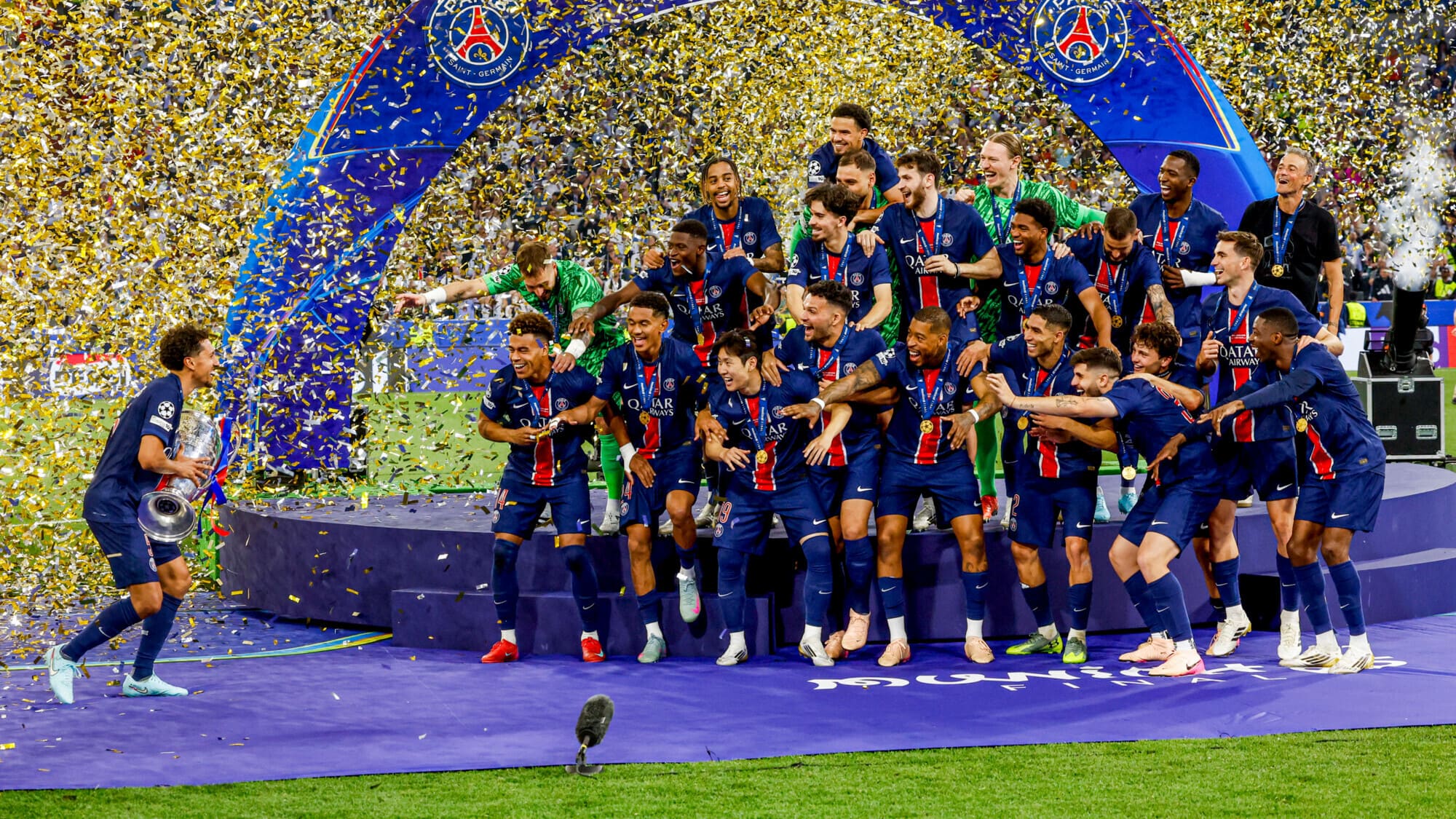 В ее состав пошли сразу семь представителей команды-триумфатора «Пари Сен-Жермен», который в минувшую субботу одержал историческую победу над миланским «Интером» со счетом 5:0. Эта победа принесла клубу из столицы Франции не только первый трофей Лиги чемпионов, но и стала самой крупной в истории всех финалов турнира с 1956 года.