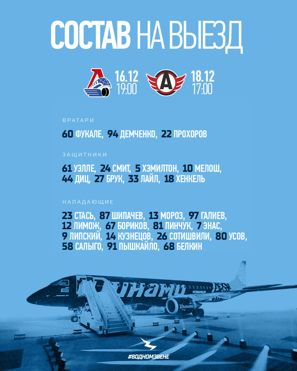На матч в Ярославль под руководством главного тренера Дмитрия Квартальнова отправились 26 игроков основного состава.