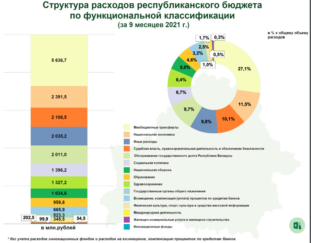 Согласно отчету Министерства финансов, за 9 месяцев текущего года было потрачено 33 208,8 млн рублей консолидированного бюджета (консолидированный бюджет Республики Беларусь состоит из республиканского бюджета, консолидированных бюджетов областей и бюджета г. Минск), из которых: