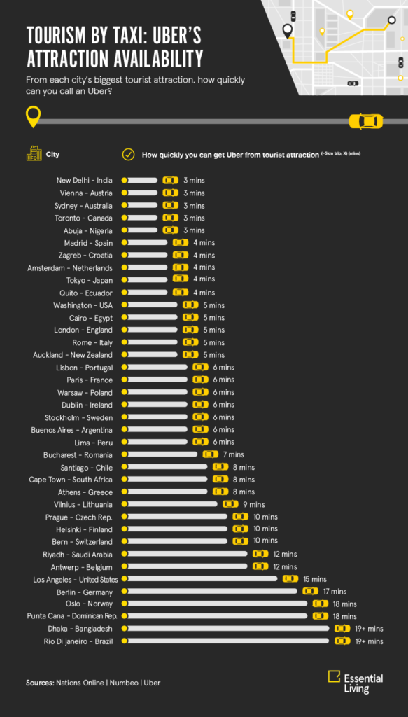 Исследование показывает, как быстро вы можете вызвать Uber, приехать и осмотреть основные туристические достопримечательности в 38 разных городах мира.